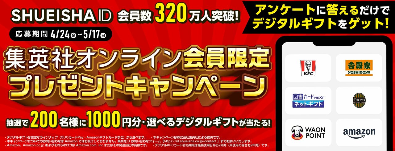 ・本キャンペーンは株式会社集英社による提供です。本キャンペーンについてのお問い合わせは Amazon ではお受けしておりません。集英社ID お問い合わせフォーム【https://id.shueisha.co.jp/contact】までお願いいたします。